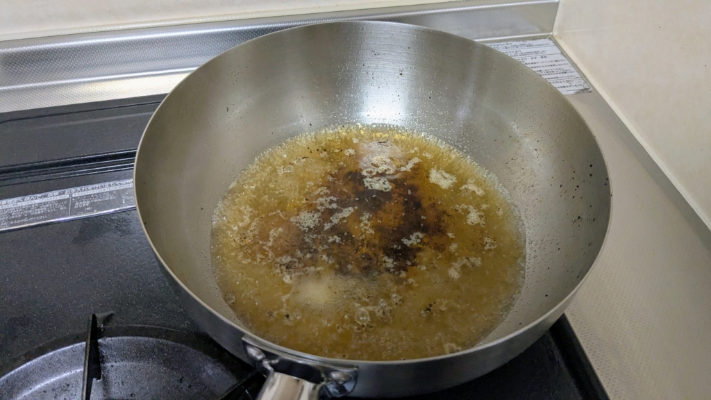 鉄フライパンと違って良いところは、最後に油を塗るのが必要ないところですね。