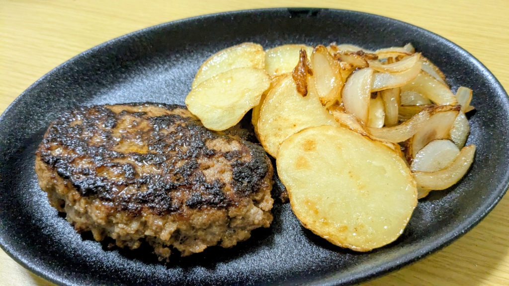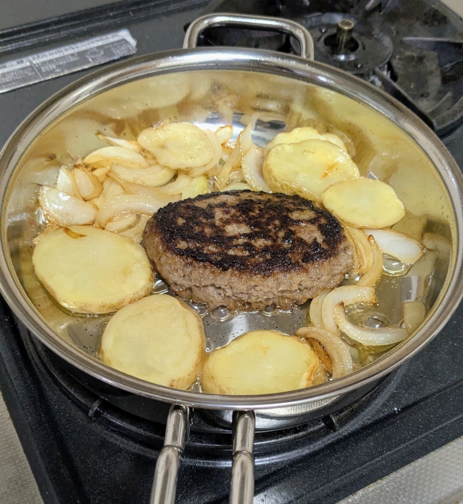 片面を焼いて裏返し、ハンバーグから油が出てきたところで玉ねぎとじゃがいもを投入。